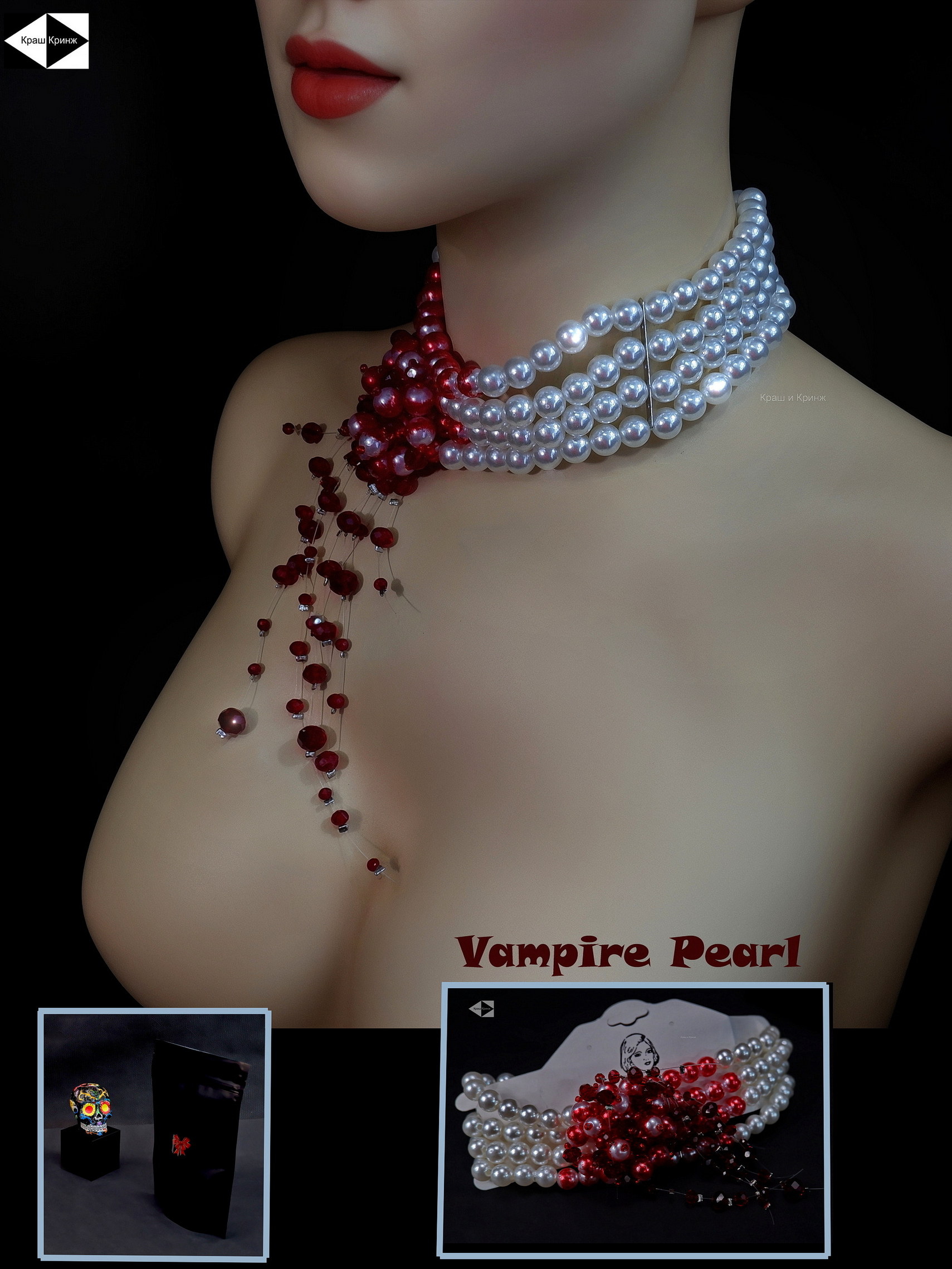 Ожерелье «Укус вампира» — изысканное украшение. Ожерелье украшено искусственным жемчугом и хрустальными бусинами. Это прекрасный подарок для любителей готического стиля и вампиров.